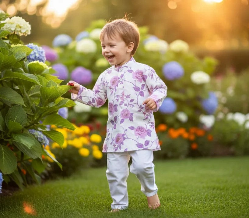 Let your little one bloom in this elegant off-white kurta set. The kurta is adorned with a beautiful and classic purple rose floral print, creating a sophisticated and charming look. It is perfectly paired with crisp white pajama bottoms, offering a complete, ready-to-wear outfit for any special occasion.
