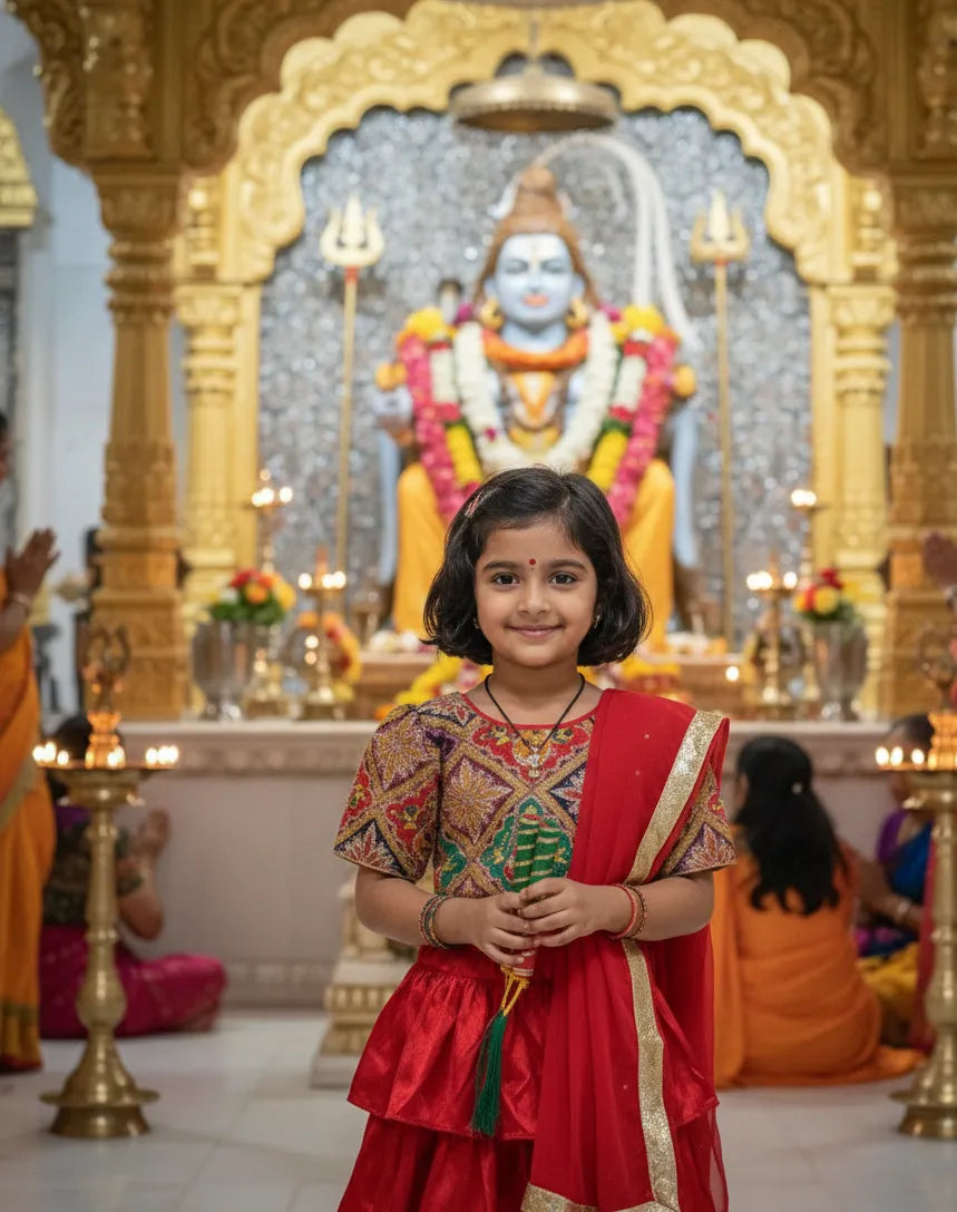 Get your little one ready to twirl and celebrate in this stunning 3-piece lehenga choli set. This outfit is a beautiful mix of traditional and modern style, featuring a vibrant, multi-color brocade choli and a show-stopping red tiered lehenga skirt. A matching red dupatta with a gold border and a decorative tassel (latkan) complete the entire festive look. Designed for both celebration and comfort, this set is lightweight and easy to wear.